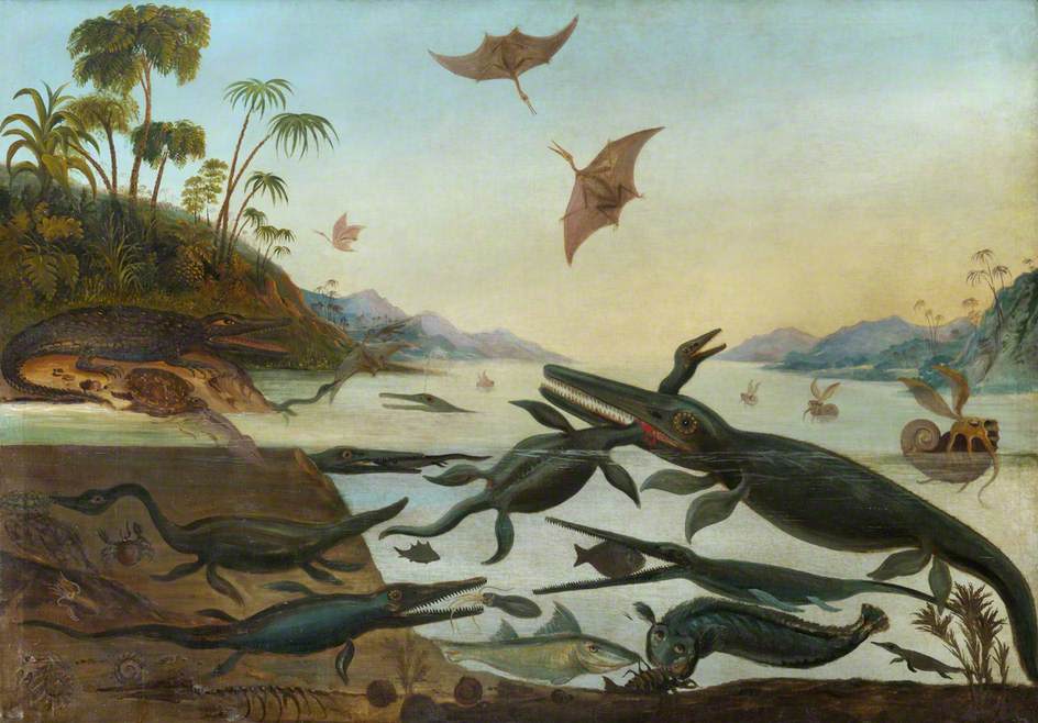 The painting, by geologist Henry De La Beche, was based on the specimens found by fossil collector Mary Anning in Lyme Regis, Dorset. Anning's discoveries had allowed another geologist, William Buckland, to describe this food chain from Deep Time, and this formed the basis of De La Beche's painting.
