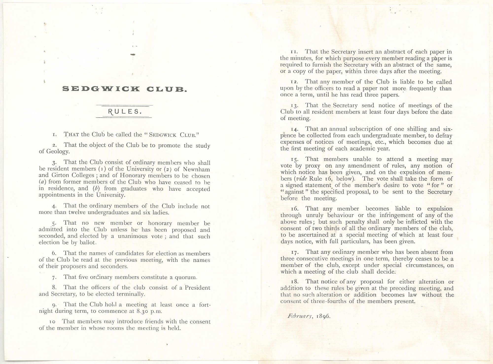 The first time women were at a Sedgwick Club meeting, 18th February 1896 (ref. SGWC 01/01/06)